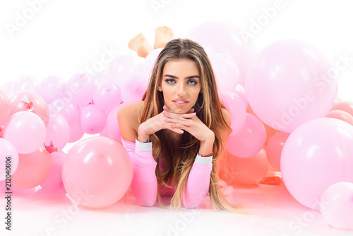 Beautiful Woman With Air Balloons Birthday Holiday Party New Year Valentine Day Concept Sexy Girl Lying On Floor Among Balloons Happy Holiday Decoration With Balloons Happy Mood Happy Life Buy