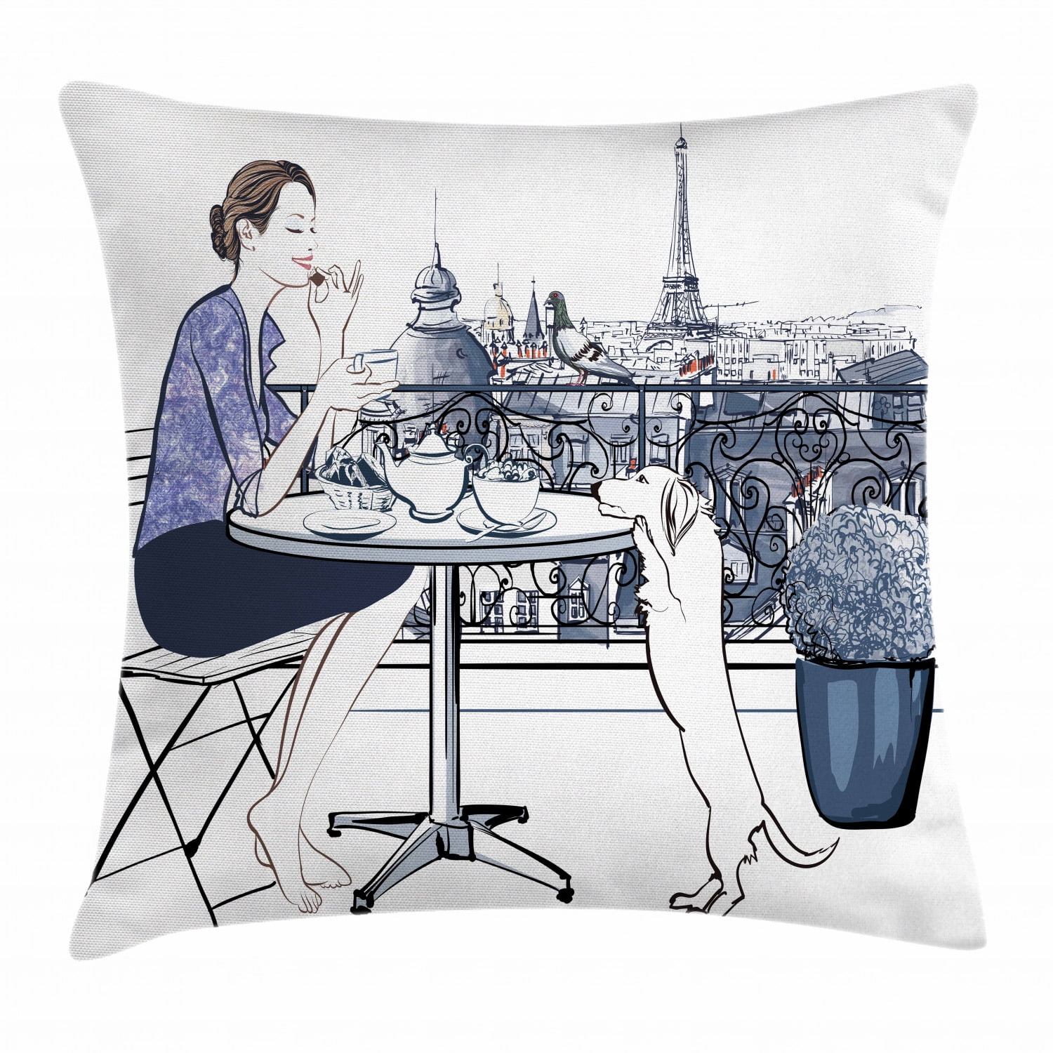 Urban Throw Pillow Cushion Cover Woman Having Breakfast With Her Dog On Balcony In Paris Doodle Image Decorative Square Accent Pillow Case 16 X 16 Inches Indigo Violet Blue White By Ambesonne