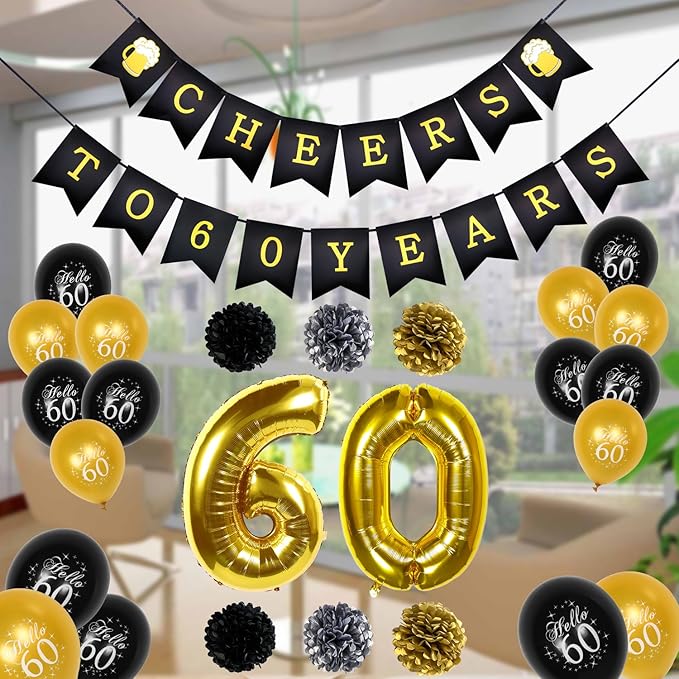 Pompon Papel Para Decoraciones Fiesta De Cumpleanos De 60 Anos Konsait Saludos A 60 Cumpleanos Decoracion Bandera Banderines Globos De Cumpleanos Numeros 60 20pcs Globos De Latex De Oro Negro Articulos De