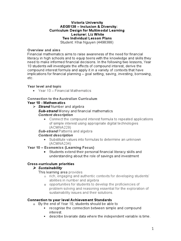 Victoria University Aeg5138 Inclusion Diversity Curriculum Design For Multimodal Learning Lecturer Liz White Two Individual Lesson Plans Percentage Compound Interest