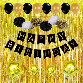 Conjunto De Decoracion De Fiesta Negro Y Dorado Cortinas Brillantes Con Flecos Metalicos Banner De Feliz Cumpleanos Globos De Latex Y Papel De Estrella Buy Conjunto De Vajilla Para Fiesta Y Decoracion Para Fiesta
