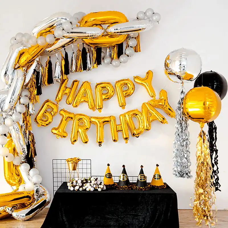 Feliz Cumpleanos Decoracion Globos Negro Dorado Y Plata Testzon