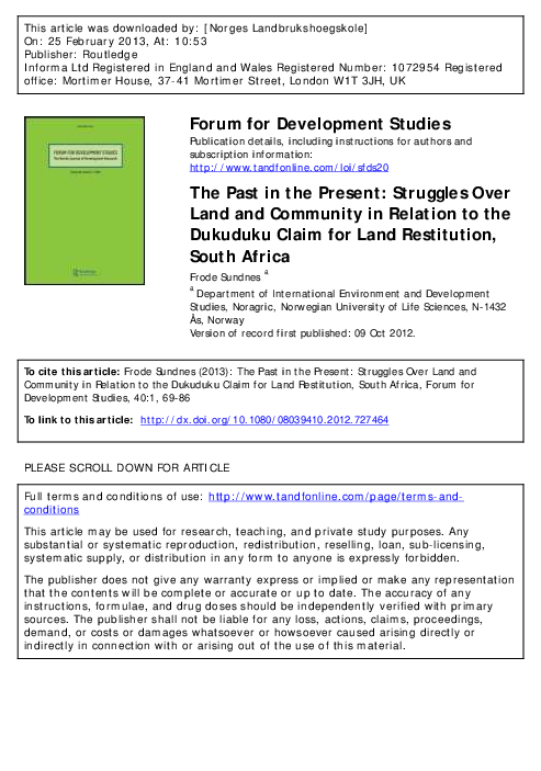 Pdf The Past In The Present Struggles Over Land And Community In Relation To The Dukuduku Claim For Land Restitution South Africa Frode Sundnes Academia Edu