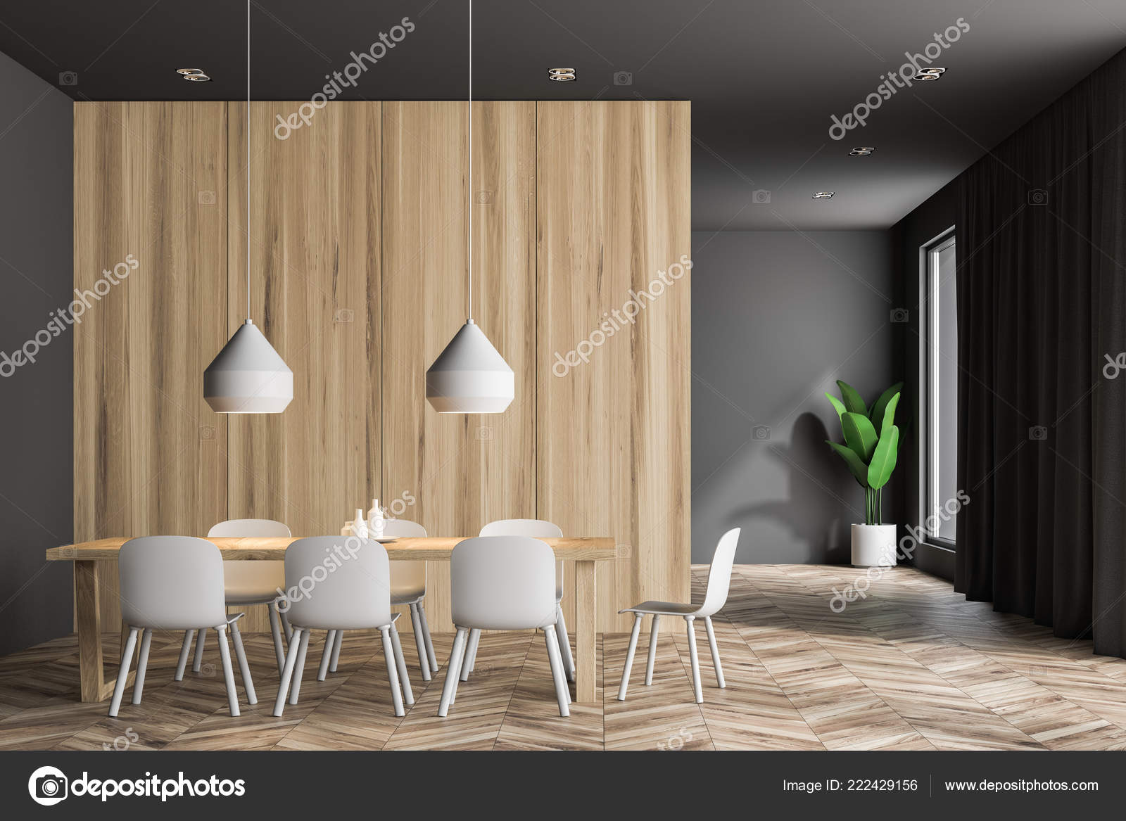 Dining Table Front View Front View Modern Dining Room Gray Wooden Walls Wooden Table Stock Photo C Denisismagilov 222429156