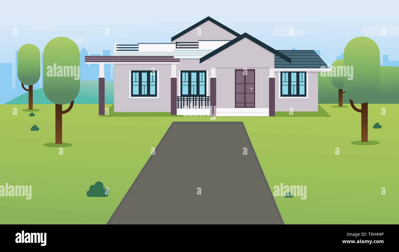 House With Green Grass Trees Hills And Cityscape Vector Illustration Flat Home Design With Garden In Town Private House In City Stock Vector Image Art Alamy