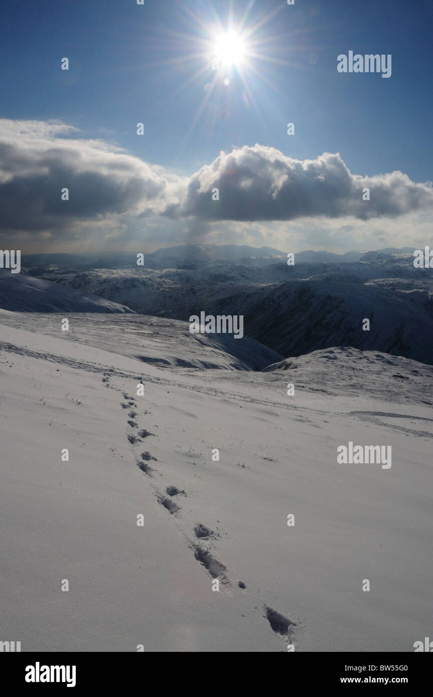 Winter Sun And Footprints In The Snow On Helvellyn Mountain In The Stock Photo Alamy