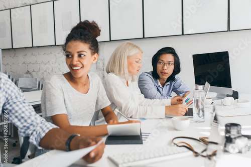 Smiling African Girl With Interested Face Expression Looking At Friend During Lecture Indoor Portrait Of Asian Student In Glasses Talking With Blonde Lady In Classroom Buy This Stock Photo And Explore