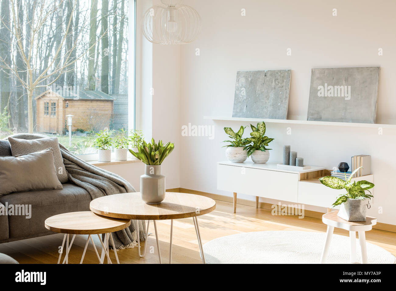 Plants On White Cupboard Under Grey Painting In Living Room Interior With View On Forest And House Stock Photo Alamy