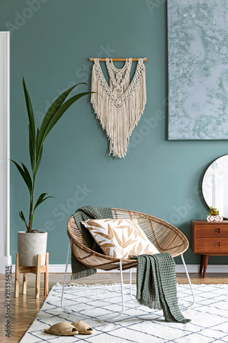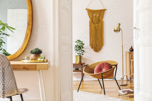 Stylish And Warm Interior Of Apartment Studio With Gold Armchair Wooden Mirror Design Furnitures And Accessories Plants Lamp And Big Macrame On The White Wall Modern Home Decor Of Living Room