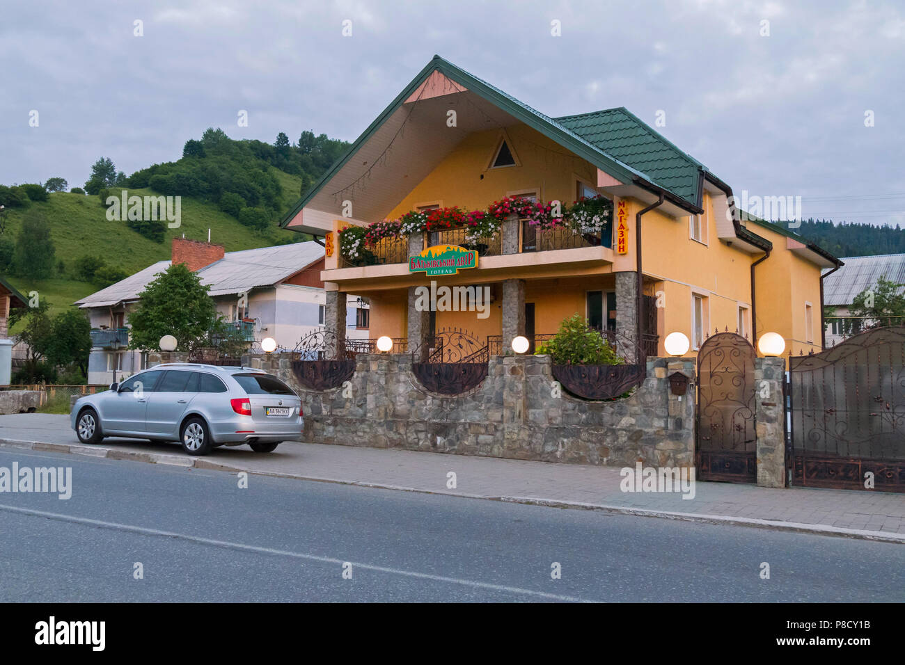 A Car Of Travelers Standing Near A Small Neat Hotel Made In A Large Private House With A Beautiful Flower Bed With Flowers Planted On The Balcony Of Stock Photo 211726295 Alamy