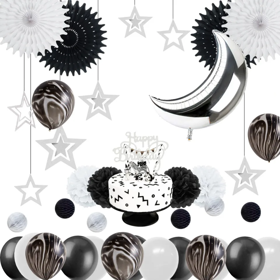 Monocromo 1st Kit De Decoracion Para Fiesta De Cumpleanos Negro Blanco Marmol Globos Plata Luna Torta Topper Kit Para Cumpleanos Baby Shower Aliexpress