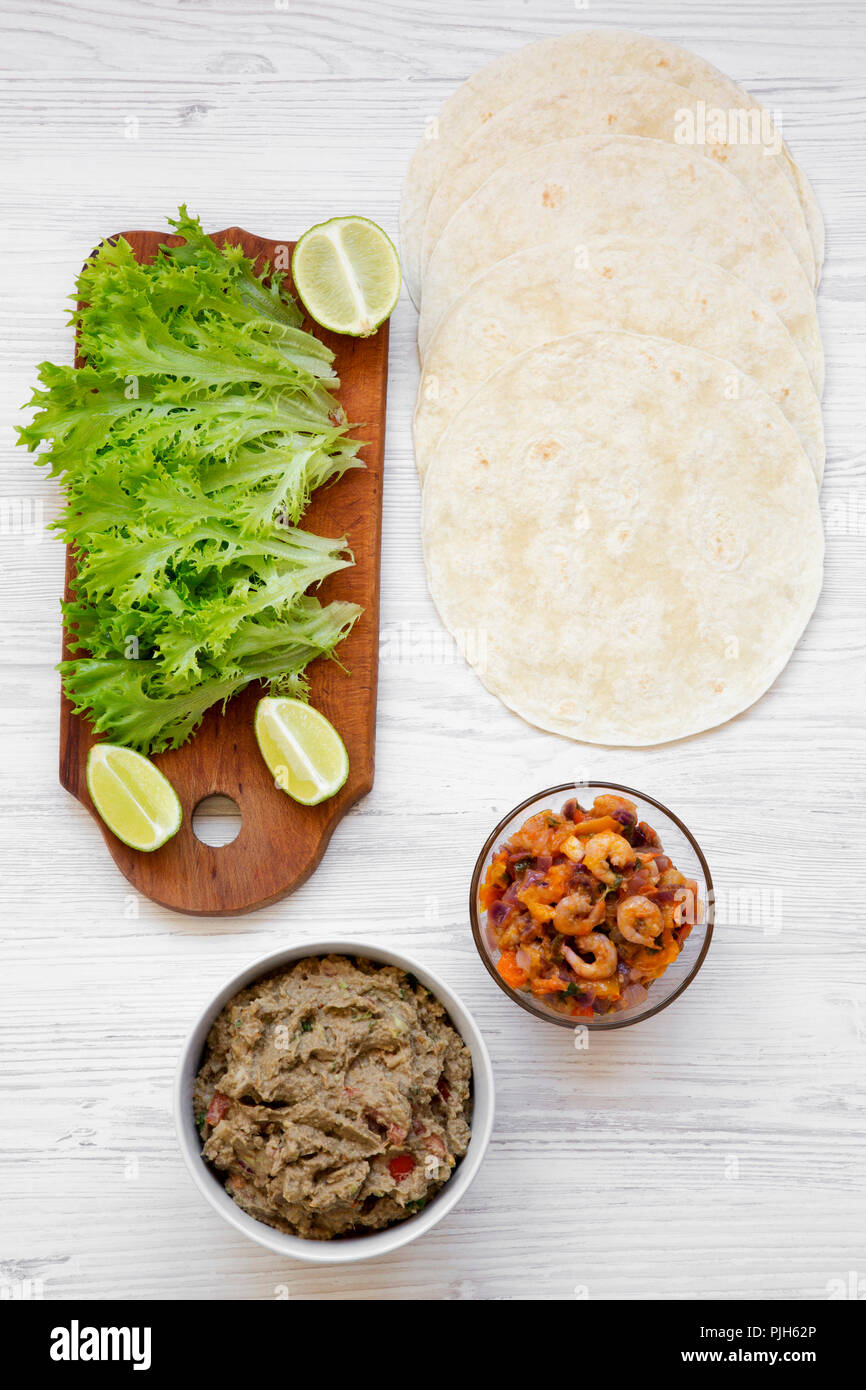 Shrimp Tacos On Wooden Board On White Wooden Table Top View Mexican Food Overhead From Above Close Up Stock Photo K60687977 Fotosearch www.fotosearch.com