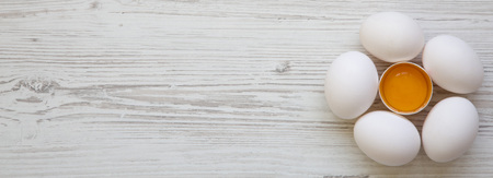 Cracked Chicken Egg Among Other Eggs On White Wooden Table Top View Flat Lay Overhead From Above Copy Space Royalty Free Images Photos And Pictures en.clipdealer.com