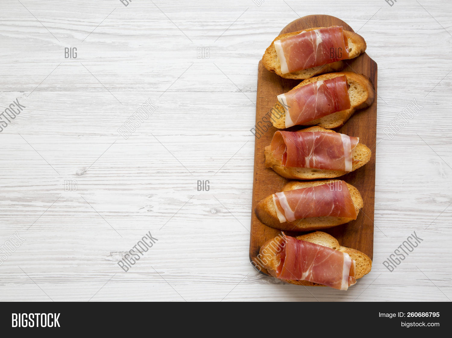 Crostini With Serrano Ham On Wooden Board On White Wooden Table Overhead View Flat Lay Top View 260686795 Image Stock Photo photostockeditor.com