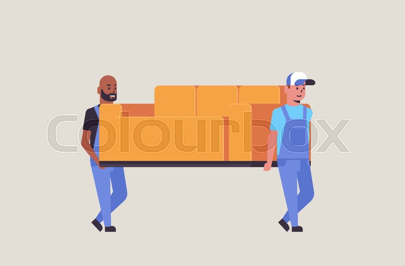 Two Mix Race Couriers In Uniform Moving Couch Express Delivery Royalty Free Cliparts Vectors And Stock Illustration Image 128445519