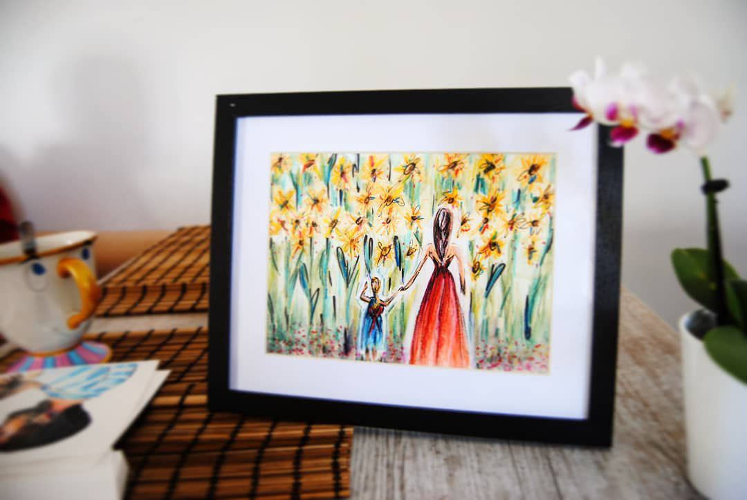 Original Sunflowers Field Mom And Daughter Watercolor Illustration Nursery Room Baby Room Decor Wall Art