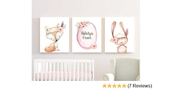 Amazon Com Set Of 3 Boho Baby Birth Stats Woodland Nursery Wall Art Print Baby Girl Room Decor Fox Bunny Rabbit Handmade